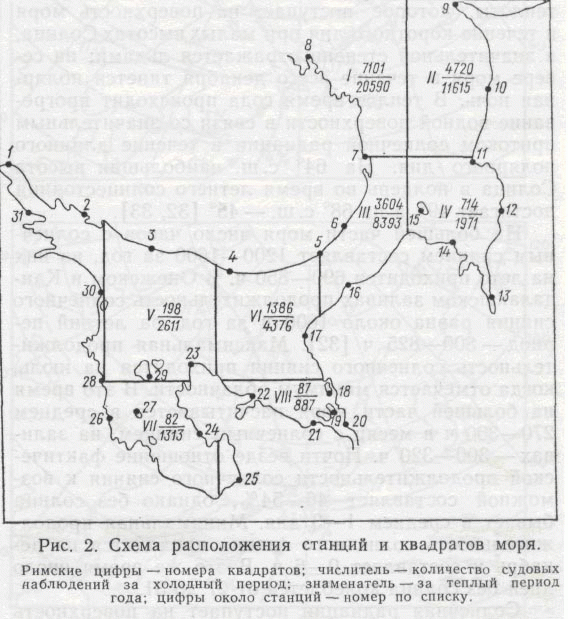 Режимообразующие факторы Белого моряНаблюдения за гидрометеорологическим режимом моря ведутся на сети станций, список которых приводится ниже (рис. 2). На рис. 2 помещены сведения о количестве судовых наблюдений за гидрометеорологическими элементами в отдельных районах (квадратах) моря. Некоторые дополнительные сведения о данных наблюдений по отдельным элементам гидрометеорологического режима приведены соответственно в последующих главах Рис. 2 |