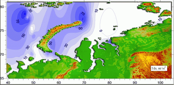 Содержание марганца в морских аэрозолях Белого, Баренцева и Карского морей