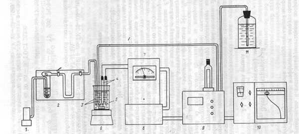 1-компрессор воздушный МК-1; 2 - установка для очистки воздуха от СО2 и NНз; 3 - капилляры для подачи раствора соляной кислоты и воздуха; 4 - электроды стеклянные ЭСЛ-11Г-05 и ЭВЛ-1МЗ; 5-стакан для титрования пробы; 6- магнитная мешалка; 7 - рН-метр "рН-340"; 8-блок автоматического титрования БАТ-12ЛМ; 9 - автоматическая бюретка Т-360Б; 10 - титрограф Т-360; 11 - бутыль с раствором соляной кислоты концентрацией 0,02 моль/л. |