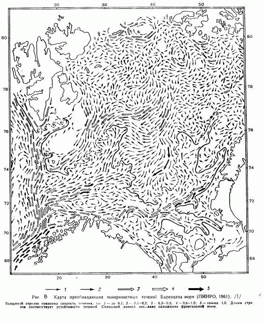 Течения в Баренцевом мореВ Баренцевом море существует сложная система поверхностных и глубинных течений, самым общим свойством которых является движение вод против часовой стрелки. Сформированная крупномасштабными процессами в системе океан-атмосфера северной Атлантики, она активно реагирует на изменчивость синоптических условий непосредственно над акваторией Баренцева моря, распространение приливной волны из Атлантики и Арктического бассейна и изменчивость плотностной структуры морских вод. Хотя скорости приливных течений больше, чем постоянных, но для переноса вод Баренцева моря наибольшее значение имеют устойчивые течения, связанные с водообменом на его границах, а также дрейфовые течения синоптического масштаба, развивающиеся под воздействием полей ветра при прохождении барических образований над Баренцевым морем. Ввиду крайне ограниченного количества инструментальных наблюдений за течениями, исследования как постоянных, так и дрейфовых течений в значительной степени основываются на применении расчетных методов. С помощью одного из таких методов, разработанных в МФ ААНИИ, рассчитана система преобладающих поверхностных течений в Баренцевом море, воспроизводящая теплые потоки воды, идущие с запада, и холодные - с севера (рисунок 6) [1].