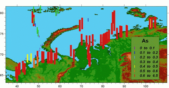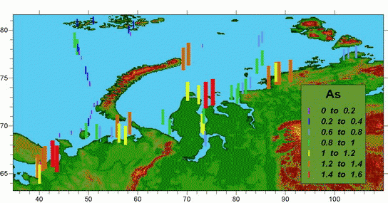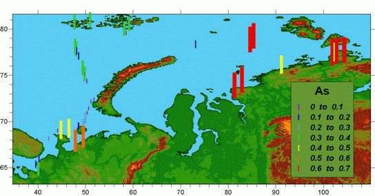 Карта пространственного распределения содержания мышьяка в морских аэрозолях Белого, Баренцева и Карского морей