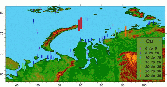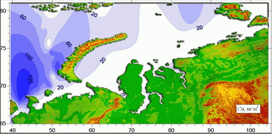 Карта пространственного распределения содержания меди в морских аэрозолях Белого, Баренцева и Карского морей
