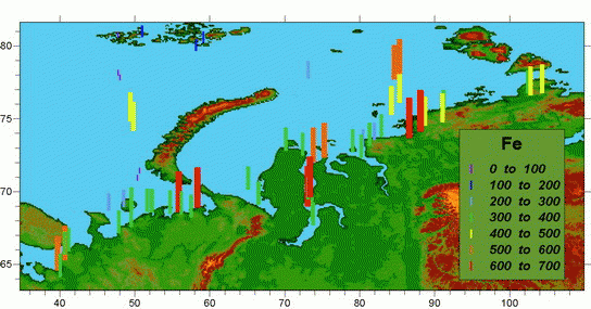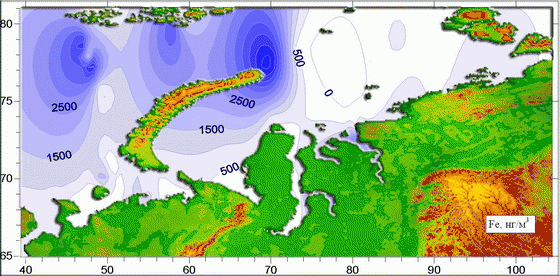 Карта пространственного распределения содержания железа в морских аэрозолях Белого, Баренцева и Карского морей