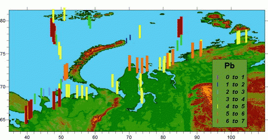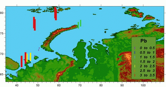 Карта пространственного распределения содержания свинца в морских аэрозолях Белого, Баренцева и Карского морей