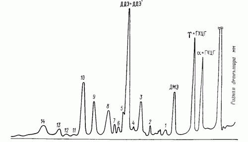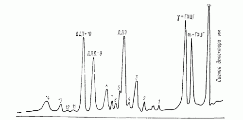 Рис. 21. Хроматограмма I на колонке с SE-30: смесь ХОП и ПХБ до дегидрохлорирования Затем берут 1 мл этой же смеси и проводят реакцию дегидрохлорирования (см. п. 4.5). Из верхнего гексанового слоя отбирают 3 мкл и вводят в хроматограф несколько раз при тех же условиях. Записывают хроматограмму 2 (рис.22). В результате дегидрохлорирования на хроматограмме 2 два пика (ДДТ и ДДД) исчезают, пик ДДЭ возрастает за счет ДДТ, появляется новый пик ДМЭ1 (производное ДДД). Пики ПХБ при этом остаются прежней высоты. Разбавляют смешанный стандартный раствор ХОП и ПХБ гексаном в 2; 4; 8 раз. Эти растворы также проводят через реакцию дегидрохлорирования и записывают их хроматограммы. Градуировочный график в координатах "высота пика - концентрация ХОП (нг/мл)", для а-, у-ГХЦГ и ДДЭ строят, измеряя высоту пика на хроматограмме 1, полученной до дегидрохлорирования. Высота пика ДДТ подсчитывается как разность высот пи- ков, имеющих соответствующее время удерживания на хромато- граммах 1 и 2 (т. е. до и после дегидрохлорирования). Аналогично рассчитывается высота пика ДДТ. Для построения градуировочного графика ПХБ сравнивают высоты отдельных пиков ПХБ на хроматограммах 2 (после дегид- рохлорирования) и стандартных растворов ПХБ. График строится в координатах "сумма высот отдельных пиков ПХБ - содержание ПХБ (нг/мл)". 1 ДМЭ - 4,4,-дихлордифенилхлорэтен.