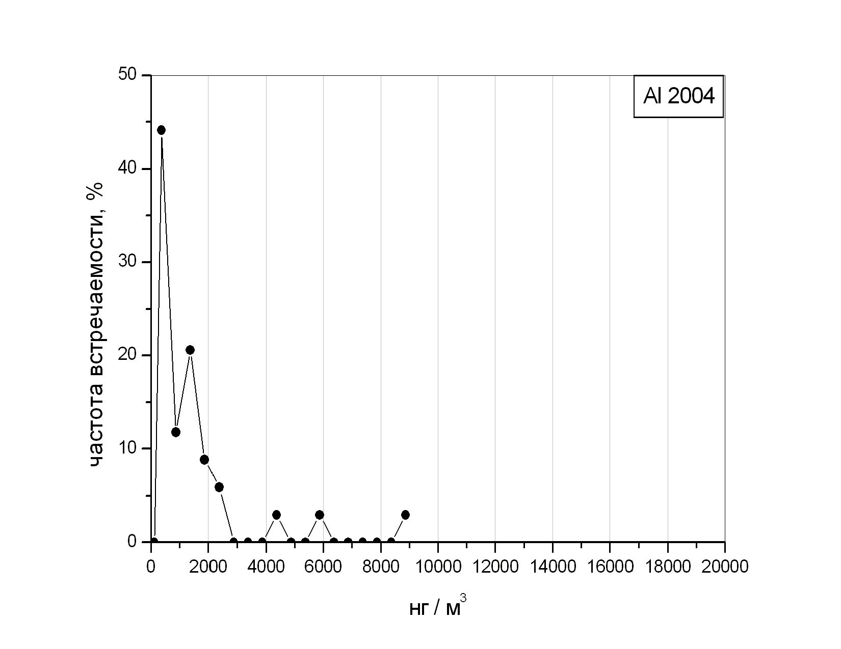 Частотный спектр встречаемости аналитических концентраций алюминия в 2004 году
