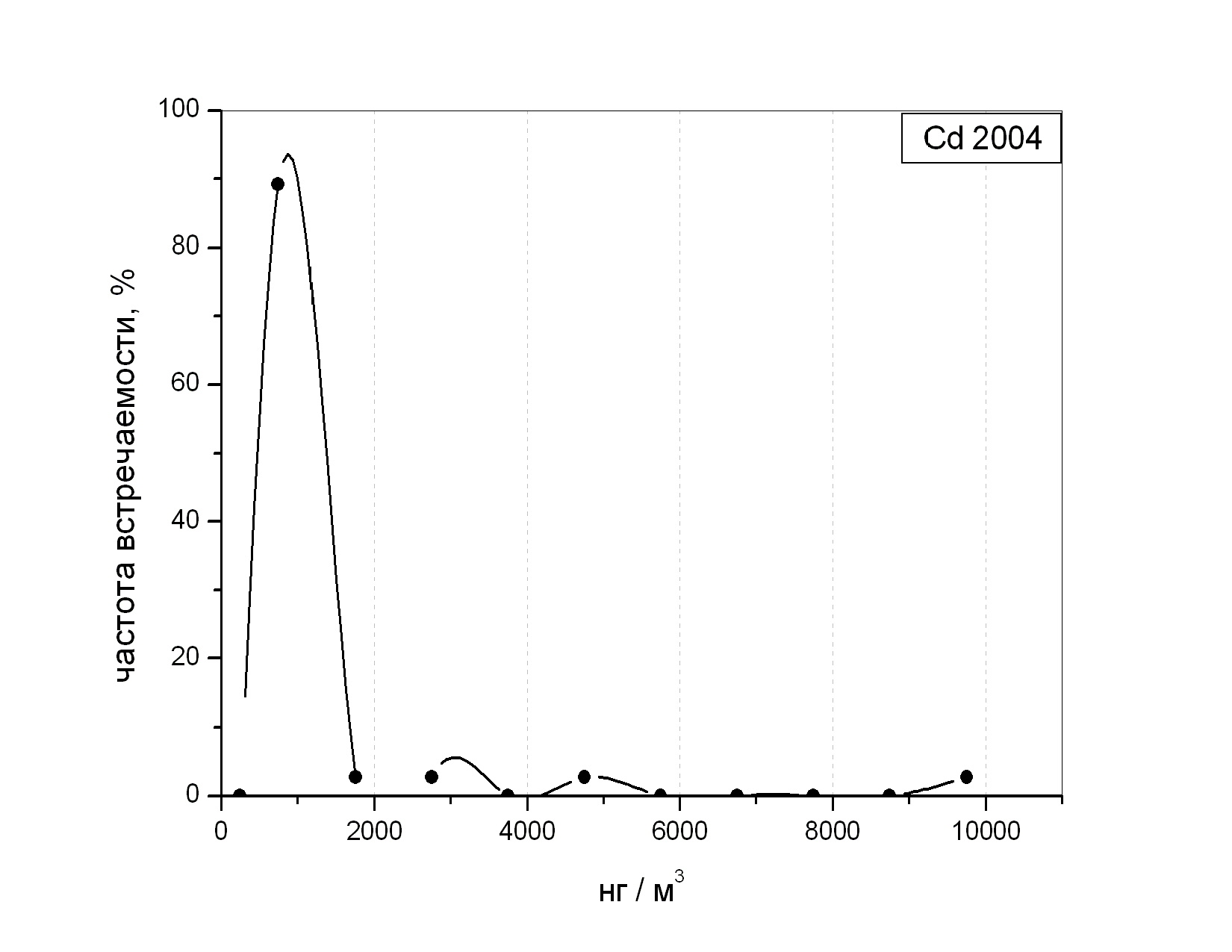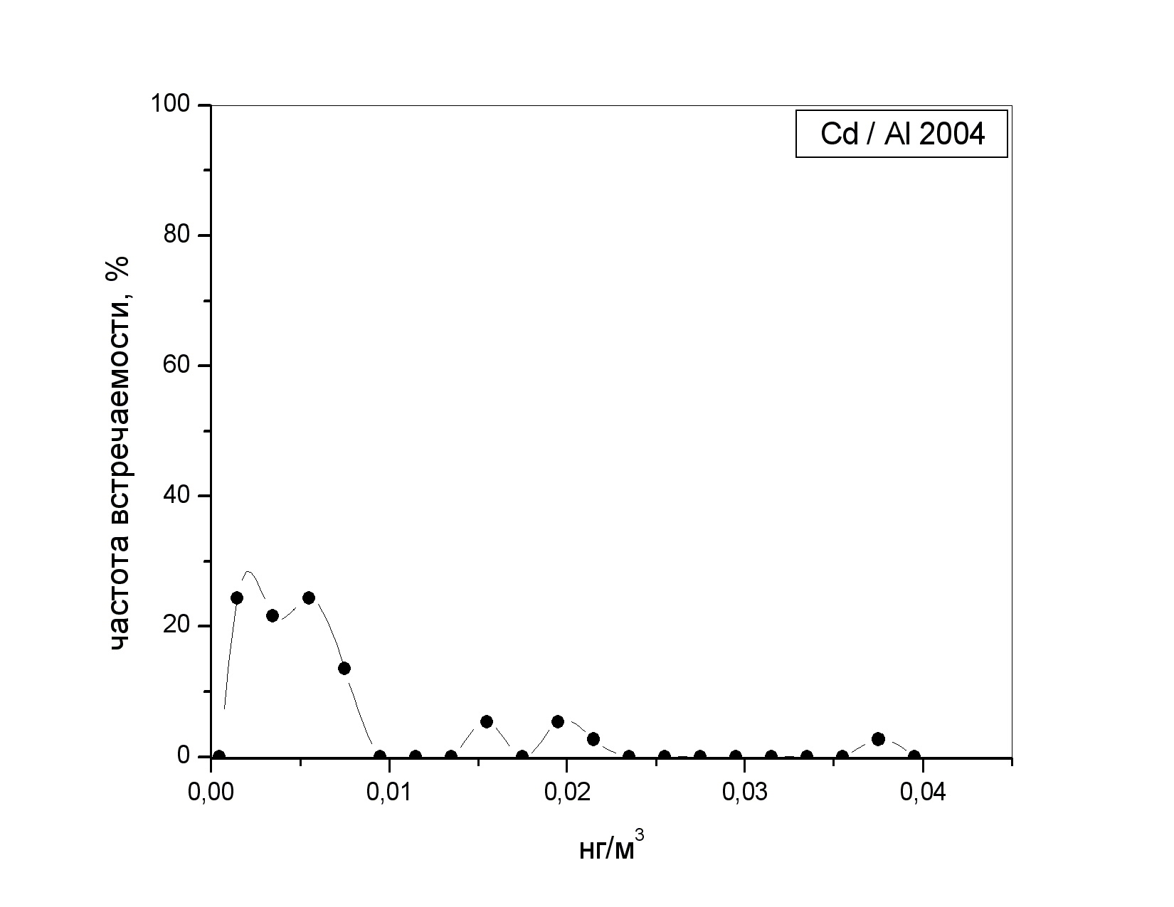 Частотный спектр встречаемости аналитических концентраций кадмия нормированных на аналитические конценрации алюминия в 2004 год
