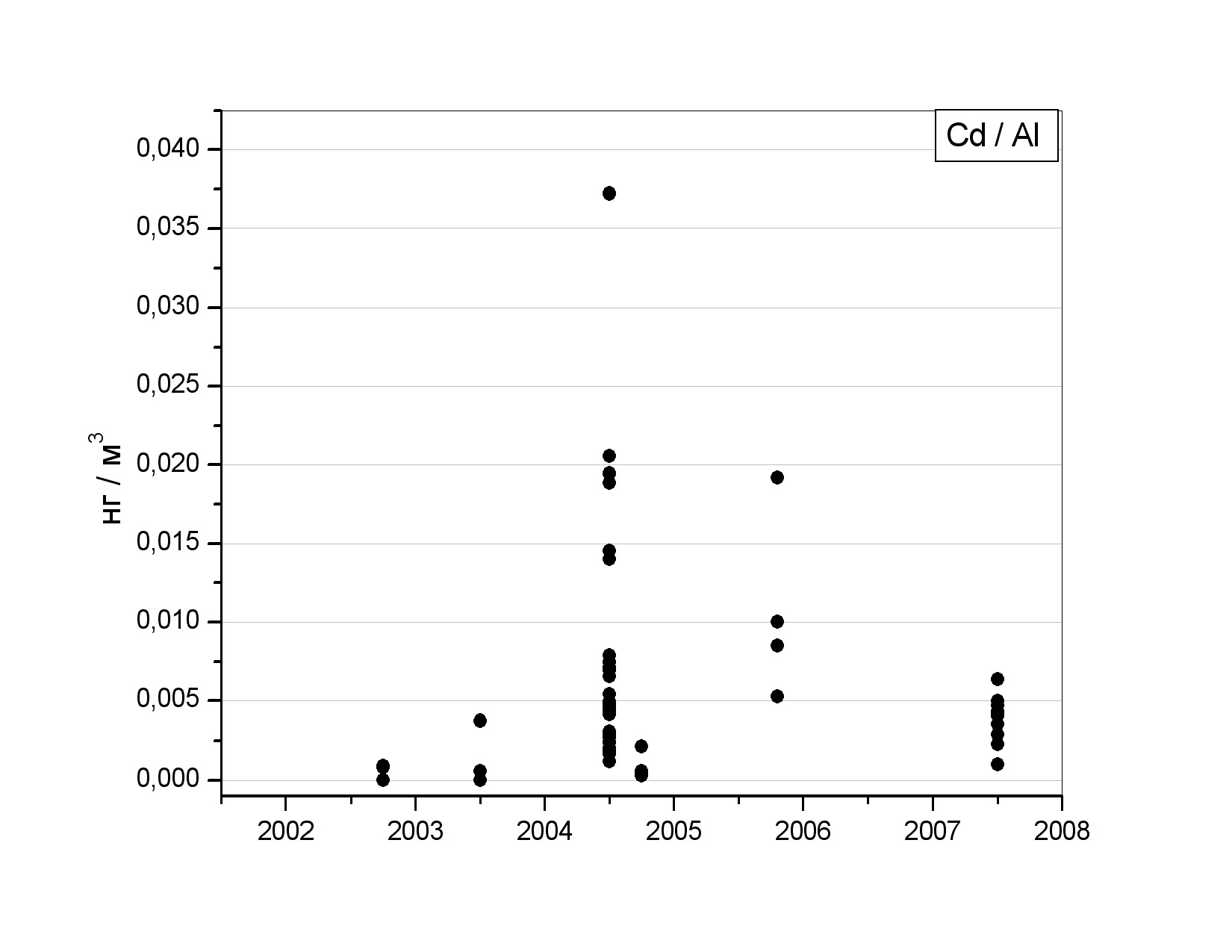 Характер распределения аналитических концентраций кадмия нормированных на аналитические концентрации алюминия