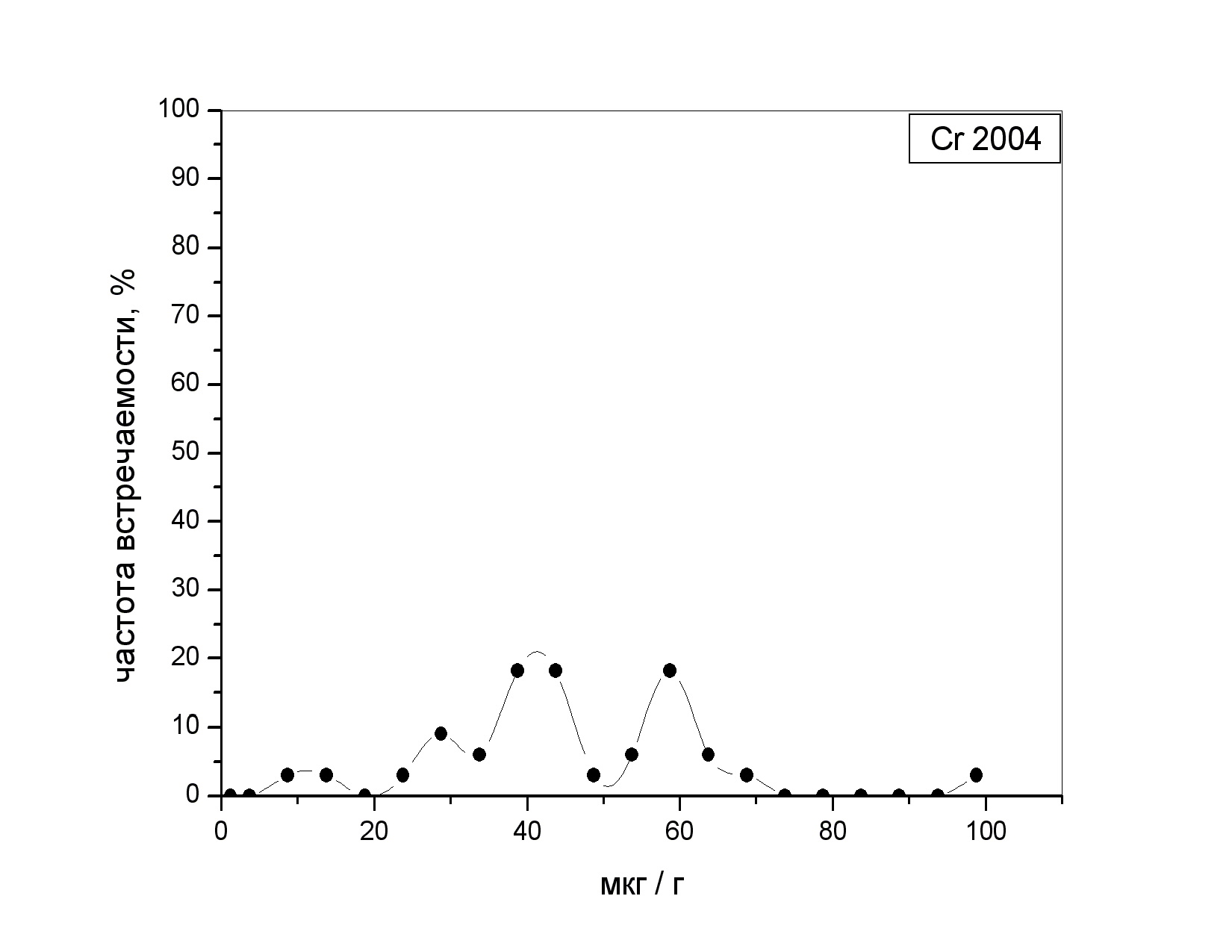 Частотный спектр встречаемости аналитических концентраций хрома в донных отложениях в 2004 году