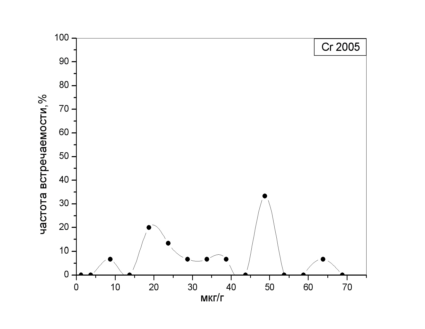 Частотный спектр встречаемости аналитических концентраций хрома в донных отложениях в 2005 году