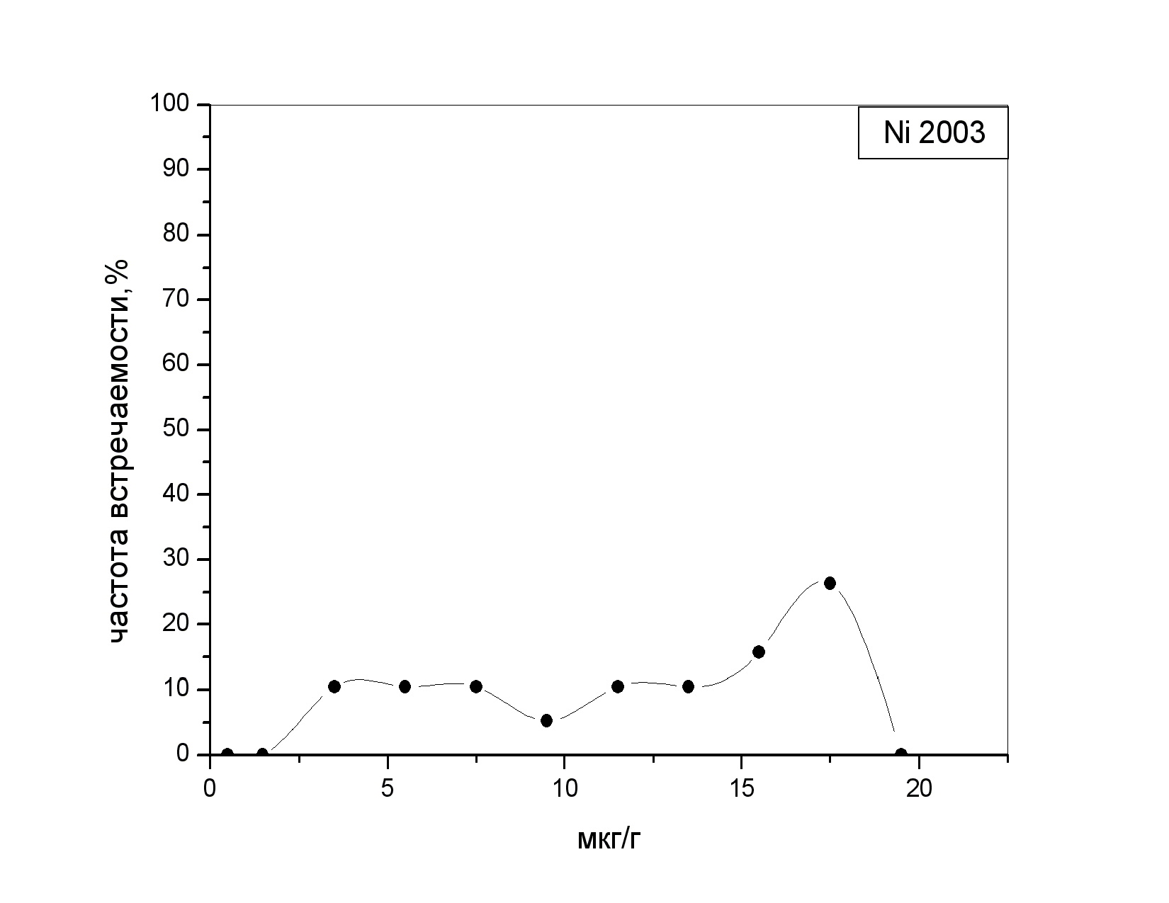 Частотный спектр встречаемости аналитических концентраций никеля в донных отложениях в 2003 году