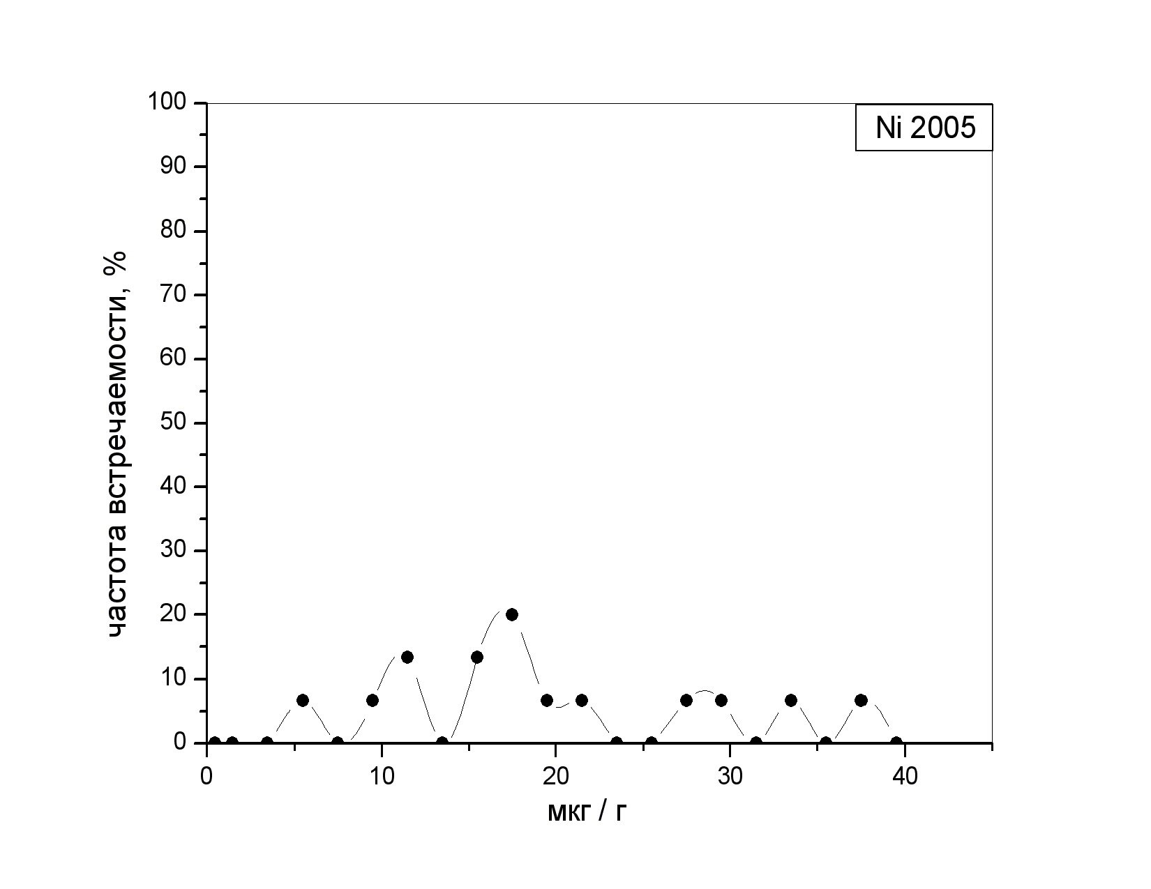 Частотный спектр встречаемости аналитических концентраций никеля в донных отложениях в 2005 году