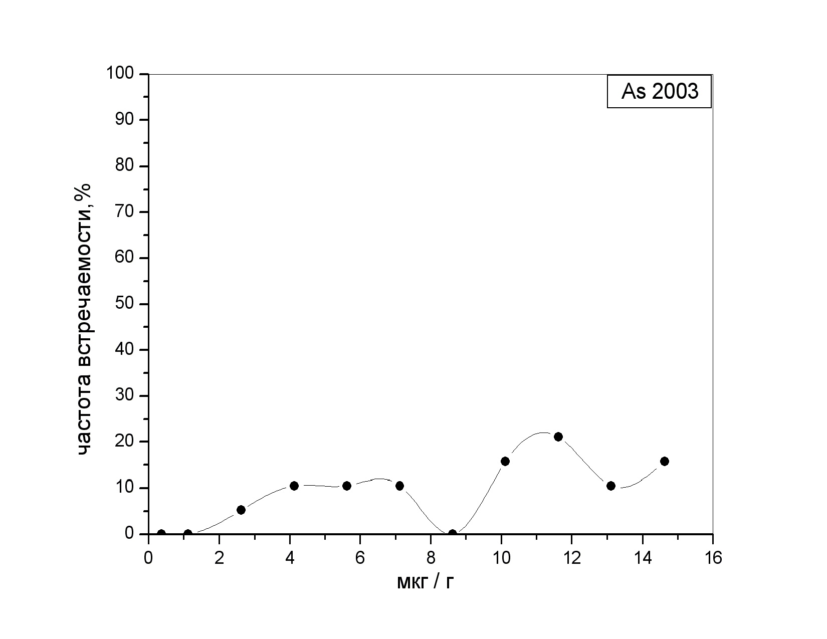 Частотный спектр встречаемости аналитических концентраций мышьяка в донных отложениях в 2003 году