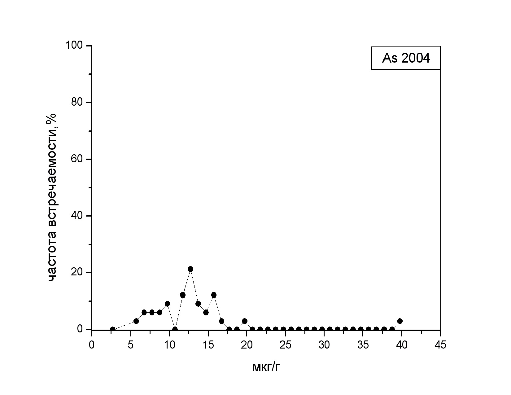 Частотный спектр встречаемости аналитических концентраций мышьяка в донных отложениях в 2004 году