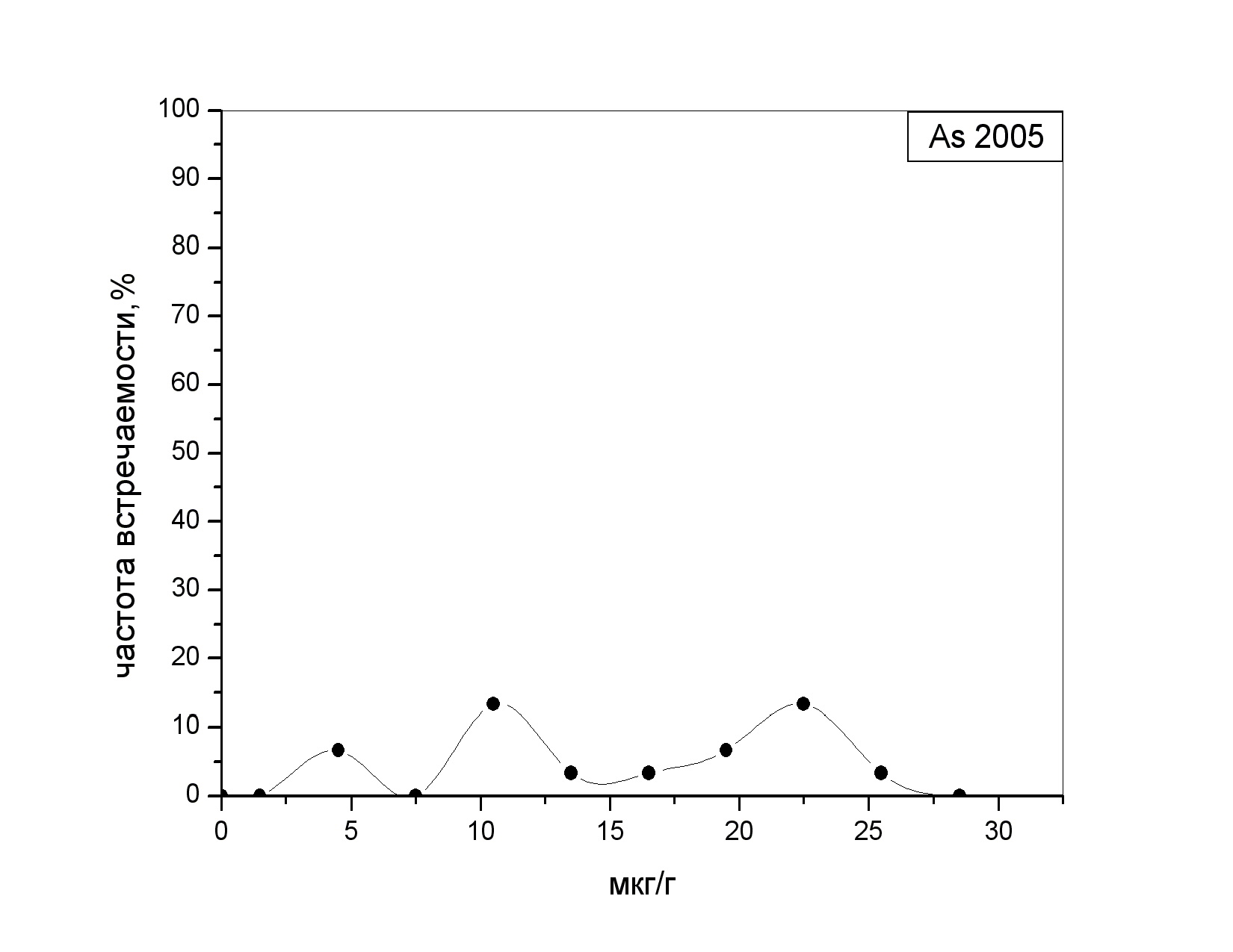 Частотный спектр встречаемости аналитических концентраций мышьяка в донных отложениях в 2005 году