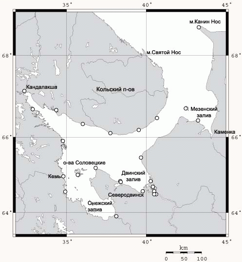 Географическое положение и границы Белого моряБелое море, расположенное на севере европейской части России, соединяется с Баренцевым морем и входит в бассейн Северного Ледовитого океана. Оно находится в субполярном физико-географическом поясе, а в структурно-геоморфологическом отношении является окраинным шельфовым морем. Расположенное к югу и востоку от Кольского полуострова между 68°40' и 63°18' с. ш. и 32°00' и 44°30' в. д., Белое море представляет собой полузамкнутый водоем, имеющий на севере условную границу с Баренцевым морем по линии м. Святой Нос - м. Канин Нос. |