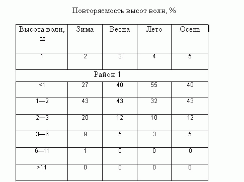 Данные о повторяемости (%) высоты волн получены с помощью математического моделирования за период 1960 - 1985 г.г. Значение 0 означает отсутствие явления или его незначительную (менее 0.5%) повторяемость.