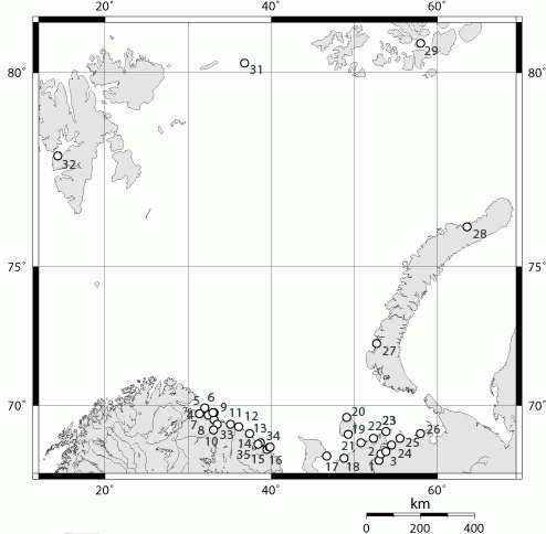 1 - Нарьян-Мар (Печерская-устьевая); 2 - Андег (р.Печора); 3 - Осколково (р.Печора); 4 - Печенга (Лиинахамари); 5 - Вайда-Губа; 6 - Цип-Наволок (бухта); 7 - м. Пикшуев; 8 - Кислогубская ПЭС; 9 - Полярное; 10 - Мурманск; 11 - Териберка; 12 - Дальне-Зеленецкая; 13 - о. Харлов; 14 - м. Черный; 15 - Иоканьга; 16 - Святой Нос (бухта); 17 - м. Микулкин; 18 - Индига; 19 - Бугрино; 20 - Колгуев Северный; 21 - Сенгейский Шар; 22 - Тобседа; 23 - Ходовариха; 24 - м. Болванский; 25 - м.Константиновский; 26 - Варандей; 27 - Малые Кармакулы; 28 - зал. Русская гавань; 29 - Обсерватория им.Э.Т.Кренкеля; 30 - о. Рудольфа; 31 - о.Виктория; 32 - Баренцбург; 33 - Цип-Наволок (море); 34 - Святой Нос (море); 35 - Губа Дроздовка.