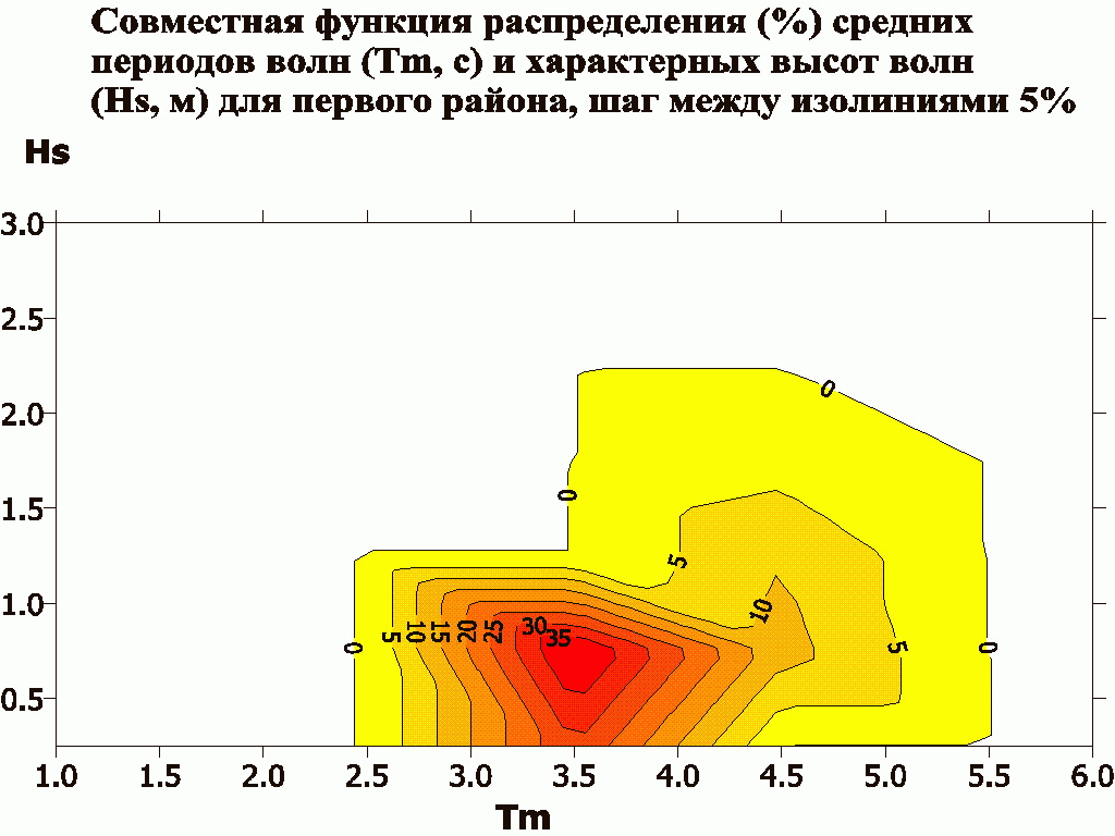 Совместная функция распределения средних периодов волн и характерных высот волн в Северном Каспии